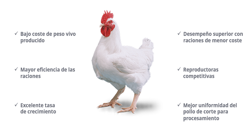 El pollo de engorde Cobb posee la menor conversión alimenticia, mejor tasa de crecimiento y la capacidad de desarrollarse con nutrición de baja densidad y menor precio. En conjunto, esas características proporcionan al Cobb la ventaja competitiva del menor coste por kg. de pesos vivo producido.